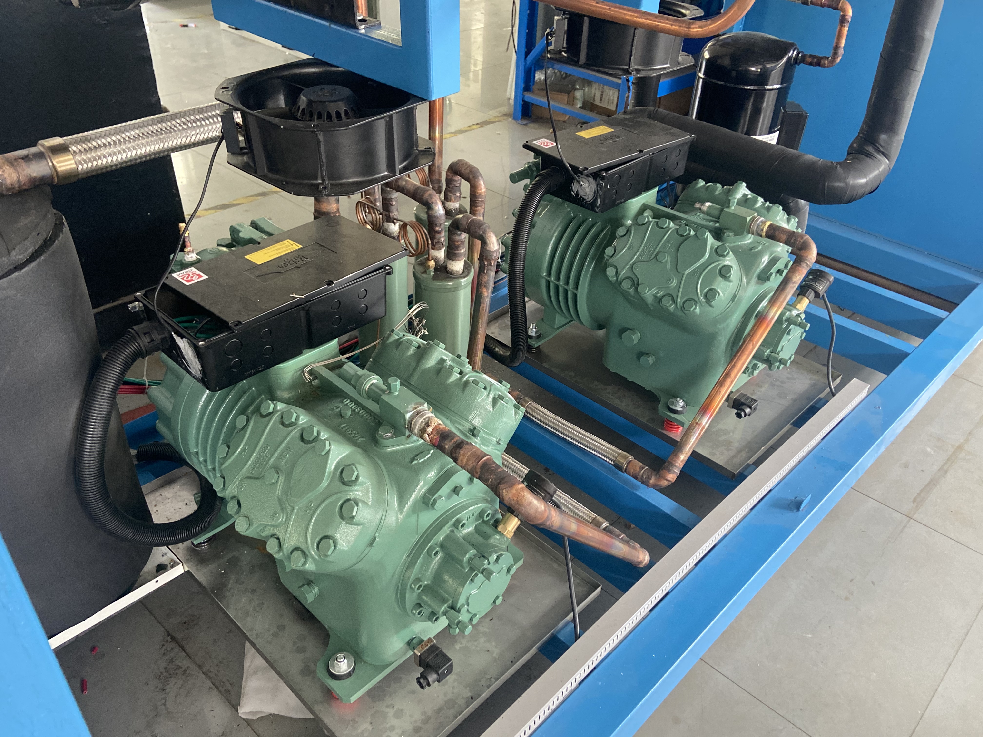 ● 氟利昂制冷壓縮機(jī)并聯(lián)運(yùn)轉(zhuǎn)時,回到每臺制冷壓縮機(jī)的潤滑油不一定和從它帶走的潤滑油量相等,必須在曲軸箱上裝有均壓管和油平衡管,使回油較多的制冷壓縮機(jī)里的油通過平衡管流回油較少的壓縮機(jī)。