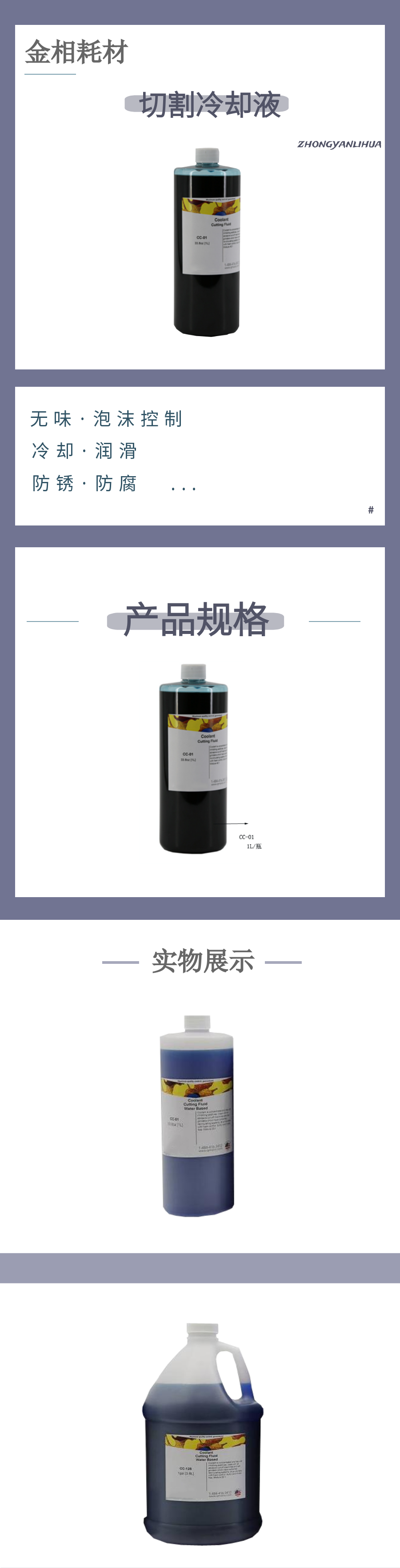 含有防銹添加劑,藍色,無味,泡沫控制,不含硫和硝酸鹽。適用于對水不敏感的材料的切割。 與水混合比1:20 |